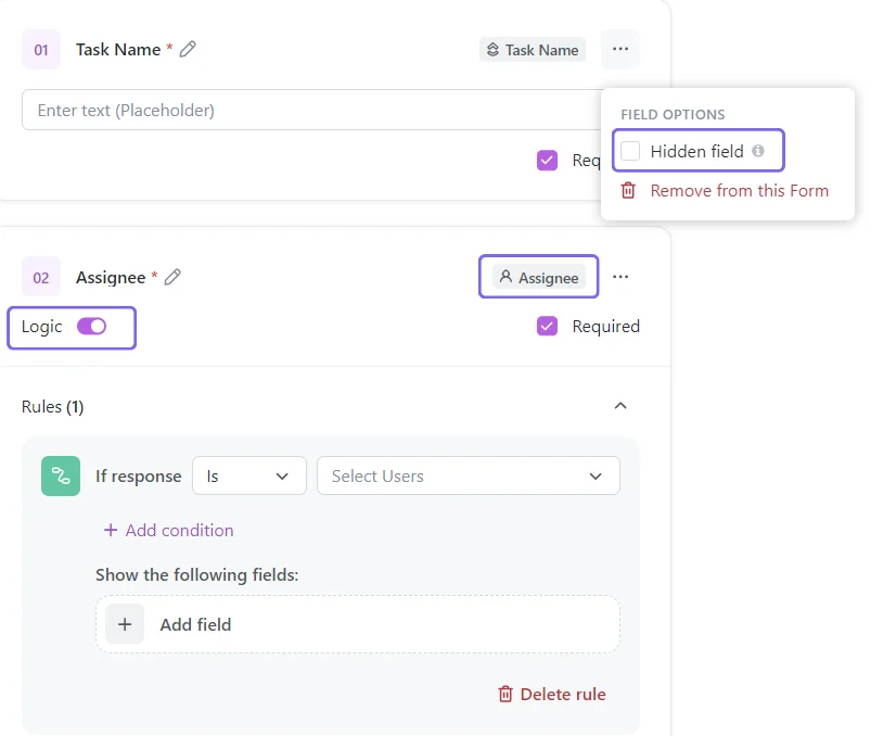 ClickUp Forms also allows you to hide specific fields from respondents. Hidden fields are especially useful when you want to pre-populate certain values or keep internal data out of view. To set a field as hidden in your ClickUp Form: