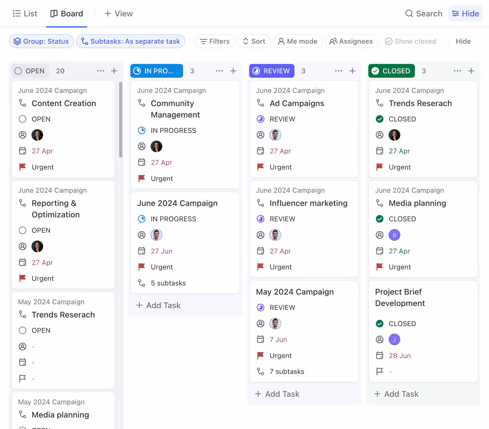 Task & Subtask: The actionable work items. Tasks represent the main deliverables, while subtasks break them down into smaller and manageable steps. For example, a task like "Launch Q4 Instagram Strategy" might include subtasks such as "Design graphics," "Write captions," and "Schedule posts."