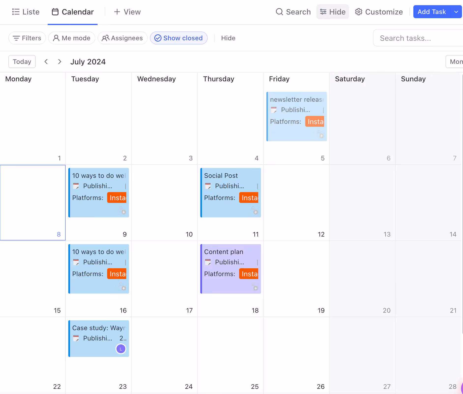 Calendar View: Ideal for time-sensitive projects and deadline management. Visualize your tasks on a calendar to ensure balanced workloads and timely completion.